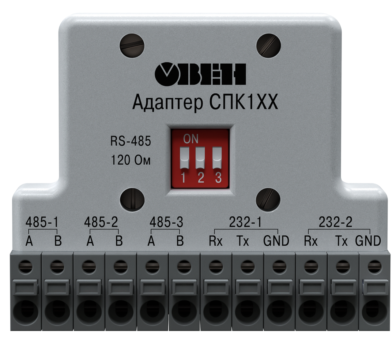 В комплект поставки входит Адаптер СПК1ХХ, представляющий собой переходник с разъемов DB9 на быстрозажимные пружинные клеммы. Адаптер имеет встроенные согласующие резисторы (120 Ом), подключаемые с помощью DIP-переключателей.